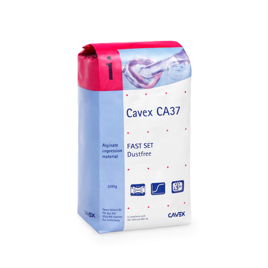 Vendor: Dukal Cavex CA37 Alginate Fast Set 500g Fast set formula Pink, with peppermint aroma Dust-free & easy mixing Smooth surface, optimum gypsum compatibility Firm consistency, more rigid impression, good tear and deformation resistance Detail reproduction at least 50μm Setting time in mouth 1...Regular price $49.99