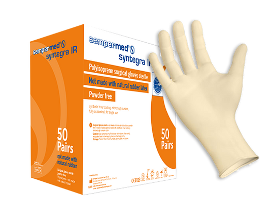 Vendor: Sempermed Syntegra IR Polyisoprene Sterile Surgical Gloves Sterile surgical glove Polyisoprene Powder-Free Micro-rough textured Fully anatomical with curved fingers Beaded cuff AQL: 0.65 Thickness: Competes with a 4-5 mil gloveRegular price From $109.99