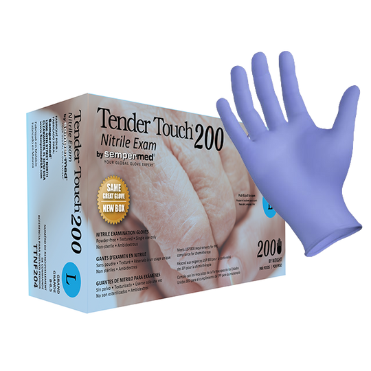 Vendor: Sempermed Tender Touch 200 Nitrile Examination Gloves Textured fingertips Tested for protection against Fentanyl Meets USP800 requirements for PPE compliance for chemotherapy Meets FDA CFR 21 Parts 170-199 requirements for food handling Powder-Free and Latex Free Thickness: Competes with 3-4 mil gloves Box=...Regular price From $17.99